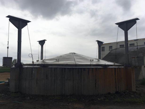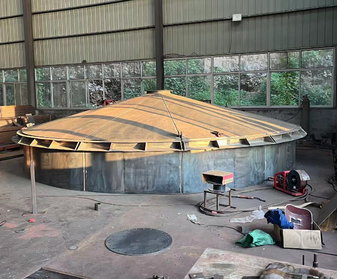 1、門體的圓錐形蓋與圓筒形立壁及外密封圈焊接成一體,圓錐形防爆蓋分為扇形弧面結構的8塊,遠程智能自復式立井防爆門的各塊之間加膠墊用螺栓緊固,主要材料為75x50x5角鋼、Q235厚度4毫米鋼板;20x80mm硅膠密封條。